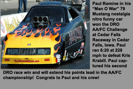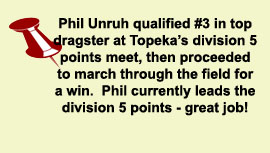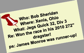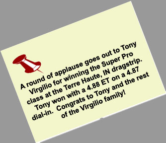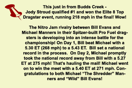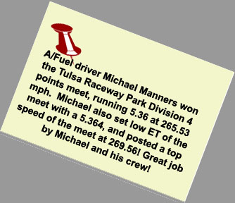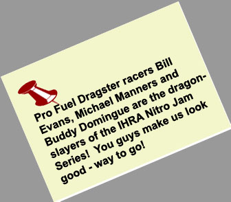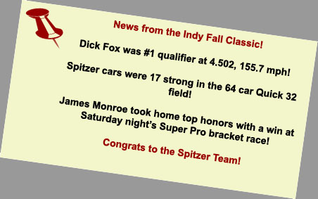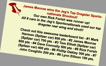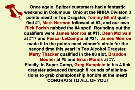 Season - end results: Michael Manners won top alcohol dragster at the World Finals in Pomona. James Monroe won the Division 3 top dragster championship and the Jegs Sportsnationals top dragster shootout. Tony Jardino captured the Division 7 top dragster championship. Phil Unruh was the Division 5 top dragster runner-up. Steve Mikus won the Division 3 super comp championship. Congratulations to all of our customers on a great season! |